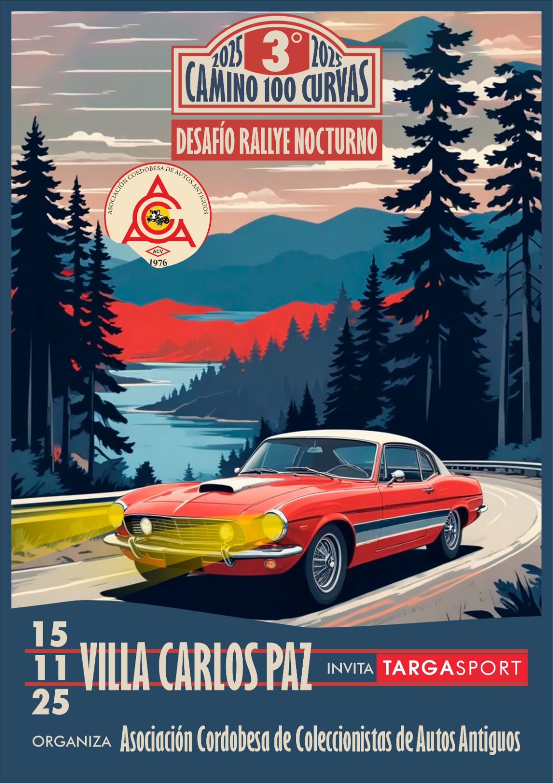 La Asociación Cordobesa de Coleccionistas de Autos Antiguos (ACCAA), en colaboración con TargaSport, el blog sobre autos clásicos, deportivos y de competición, tiene el placer de invitar a propietarios y clubes de autos clásicos y sport a participar en el emocionante 3º Desafío Nocturno Camino 100 Curvas 2025.